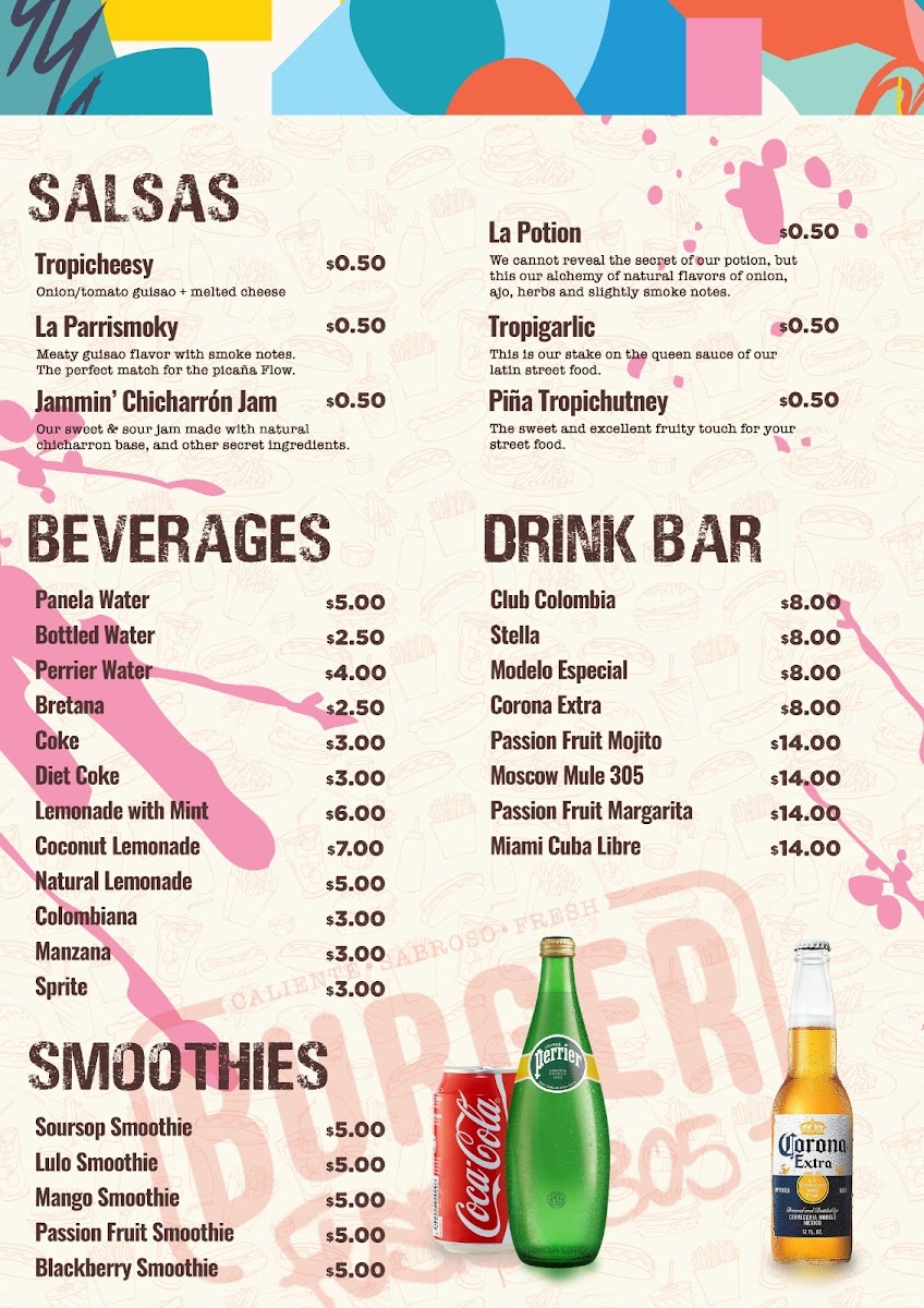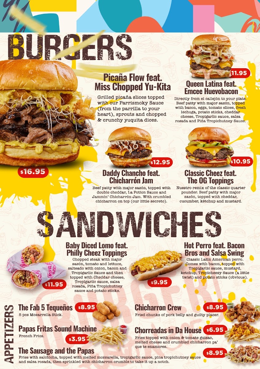 Directly from el callejón to your plate. Beef patty with major sazón, topped with bacon, eggs, tomato slices, fresh lechuga, potato sticks, cheddar cheese, Tropigarlic sauce, salsa rosada and Piña Tropichutney Sauce.
